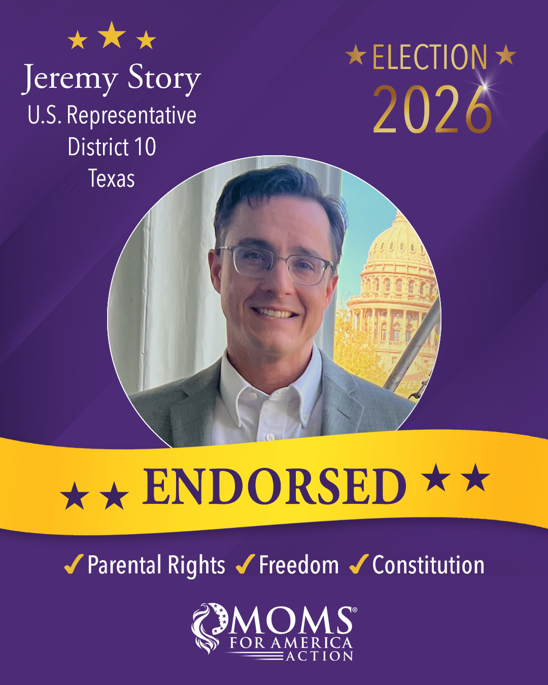 "I support Jeremy Story because he represents a conviction-driven approach to public service rather than a career built on political convenience. In a time when many voices shift with the wind, he has shown a pattern of standing where he believes principle, constitutional order, and personal responsibility intersect.